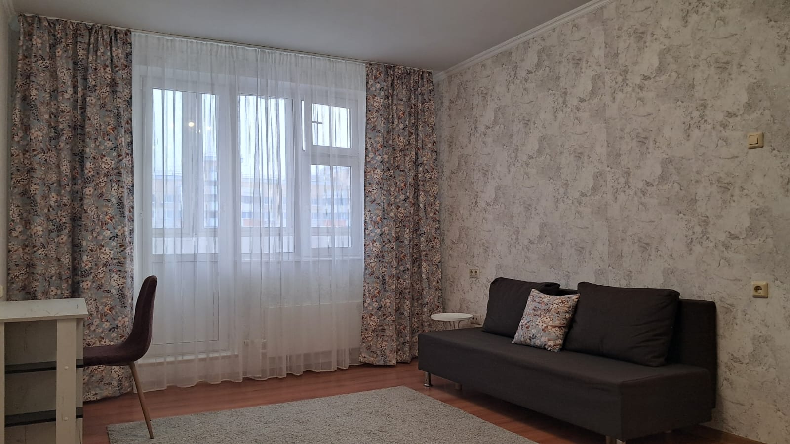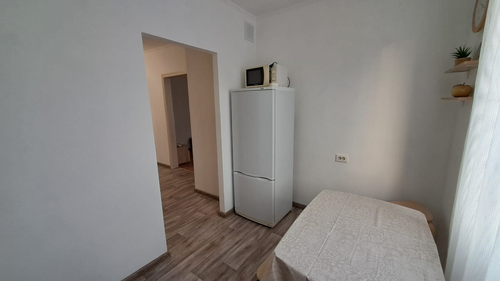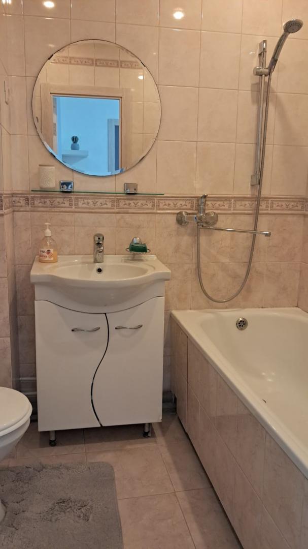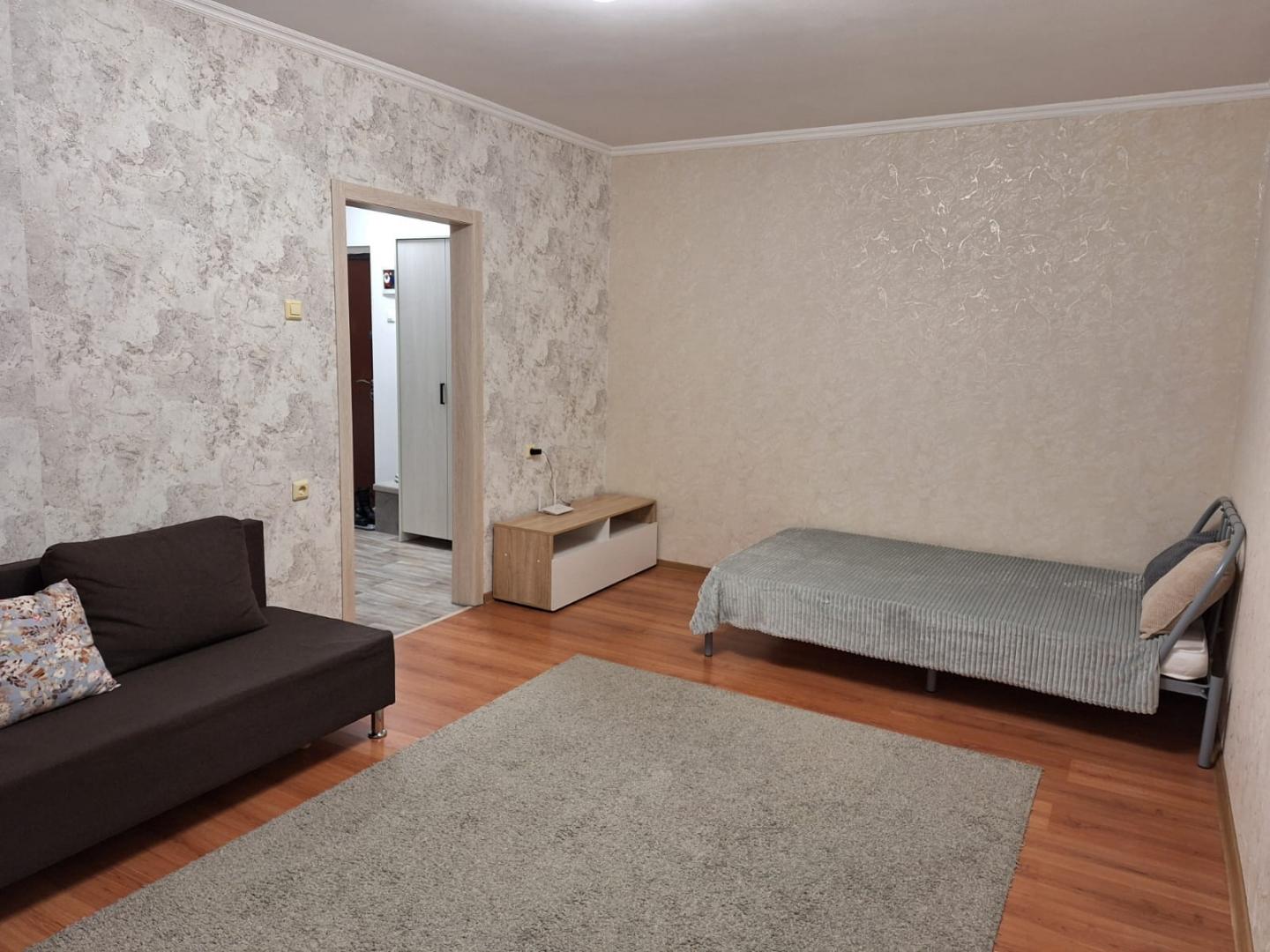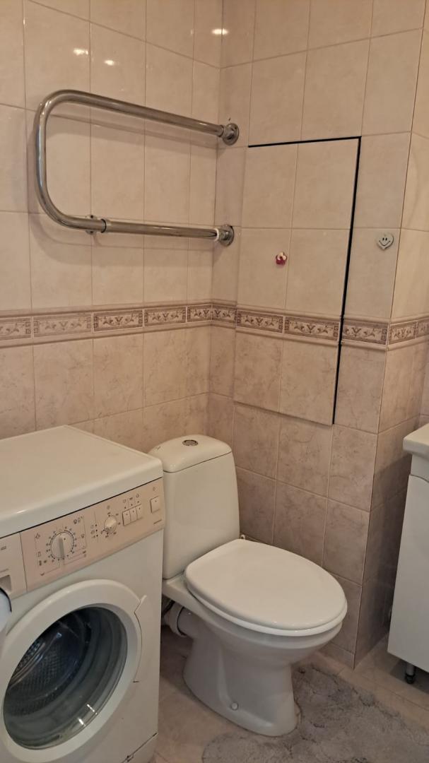 Оборудована необходимой техникой: холодильник, стиральная машина, встроенный кухонный гарнитур, микроволновая печь, комната просторная, светлая, есть 2-спальная кровать, диван.