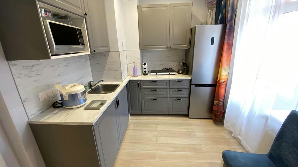 Из бытовой техники, в вашем распоряжении: стиральная машина, настольная индукционная плита (на 2- конфорки), холодильник, телевизор, кондиционер, микроволновая печь, пароварка, весы, капсульная кофе-машина, чайник, Wi-Fi роутер.